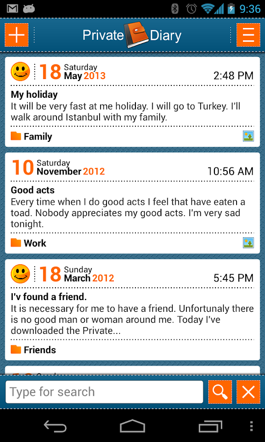This app - Private DIARY will help to you to record your life. It will save all your emotions and interests. You can entrust him all secrets.